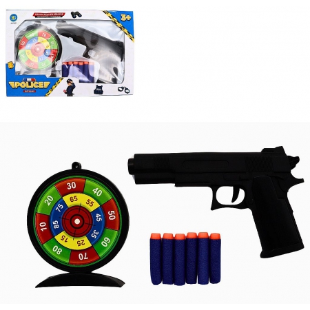 COFFRET PISTOLET 6 FLECHES MOUSSE 18 CM AVEC CIBLE